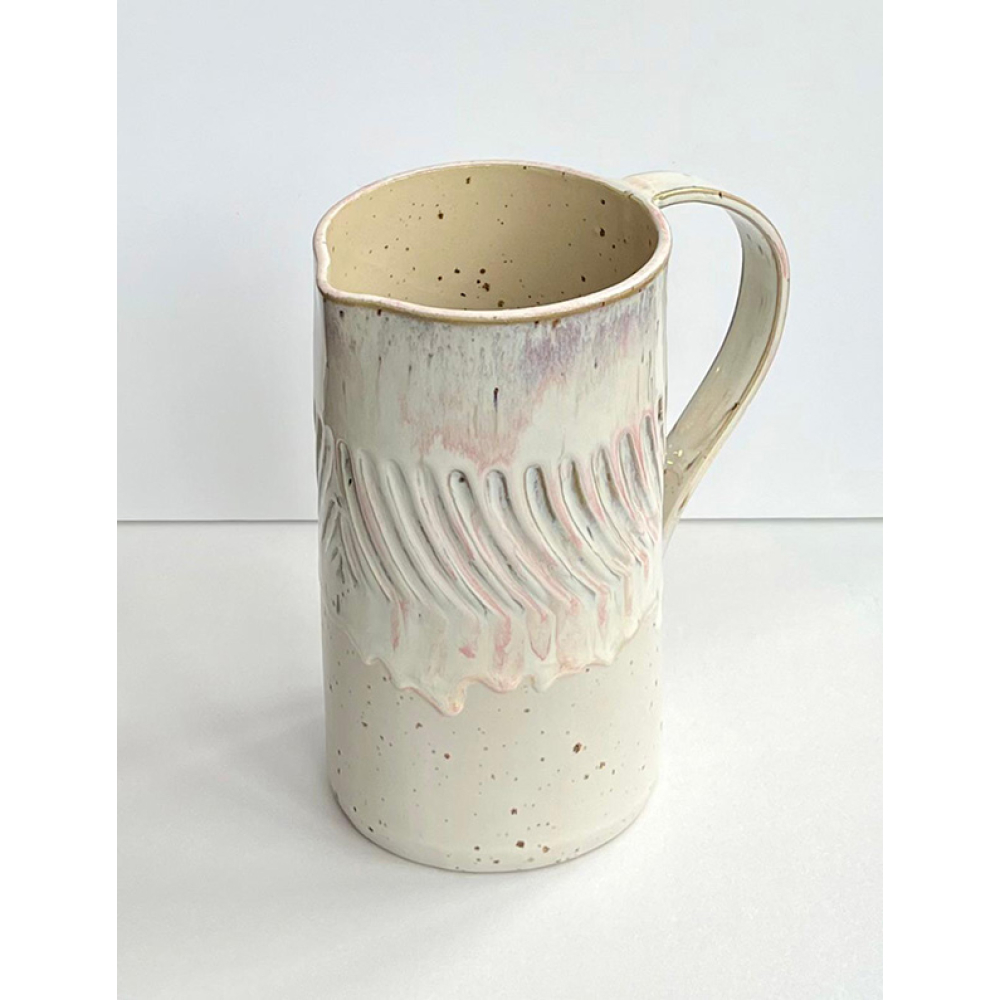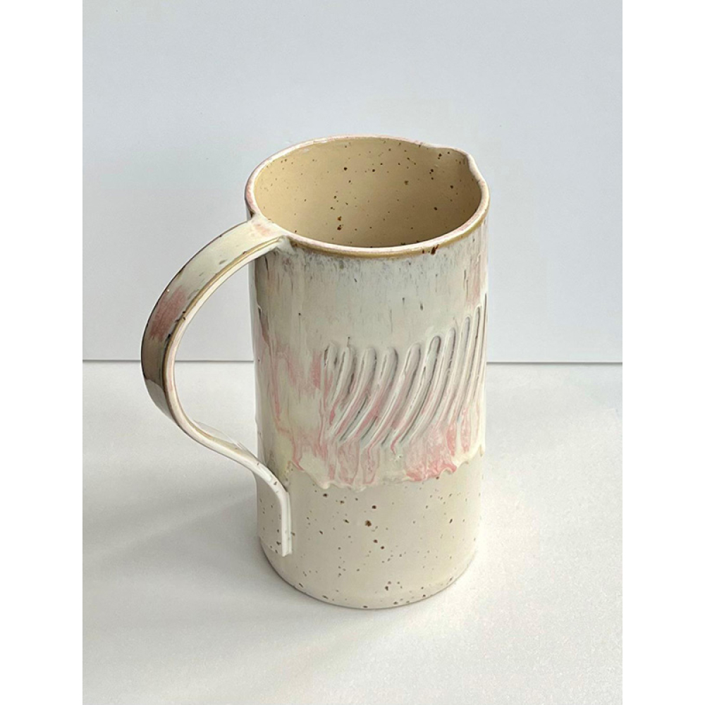 Kan, goed te gebruiken als waterkan. Er past ruim 1 liter in. Van boven glimmend glazuur in romig wit met roze tinten, van onder is het glazuur mat wit. Maat: hoogte 18,5, doorsnede ±10,5 cm.