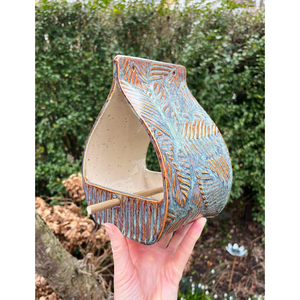 Vogelvoerhuisje. Het huisje heeft 2 ophangogen waarmee hij opgehangen kan worden, zorg voor stevig draad of ijzerdraad. Hij is weersbestendig. Met bamboe stokje.